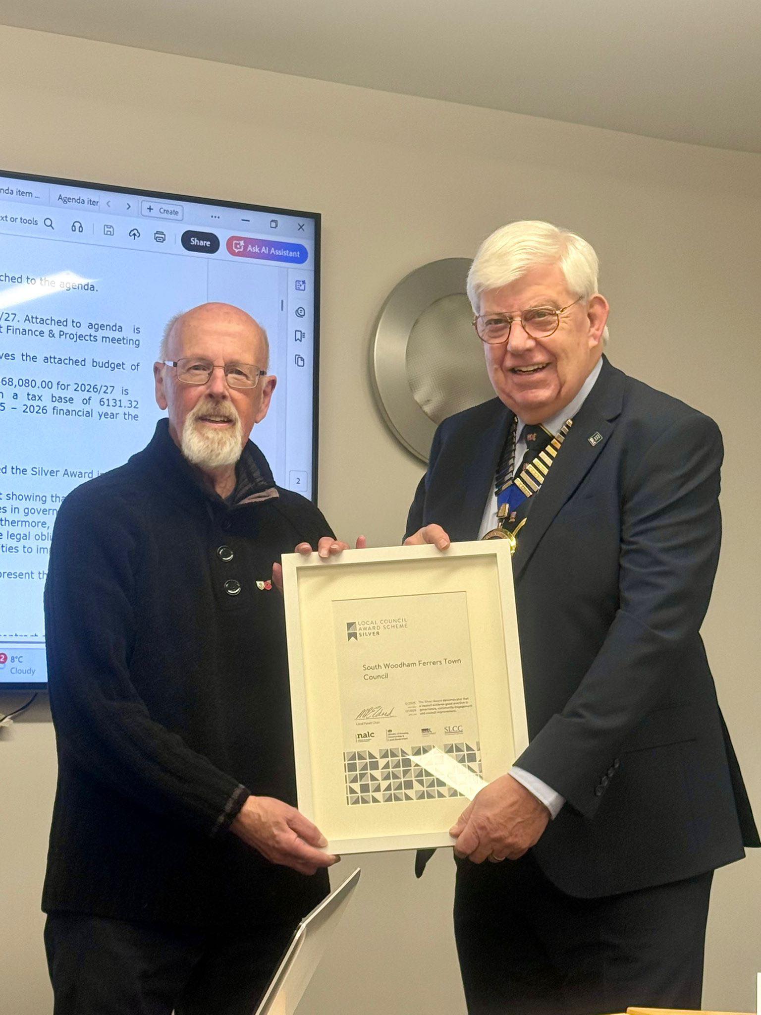 At the Council meeting held on 20th January 2026 the Town Council was honoured and delighted to be awarded the National Association of Local Council Silver Award presented by the Chair of EALC representing NALC in Essex.