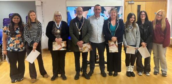 Students are pictured with the Mayor of South Woodham Ferrers, Deputy Mayor of South Woodham Ferrers, Cllr Terry Sherlock and Cllr Donna Eley.